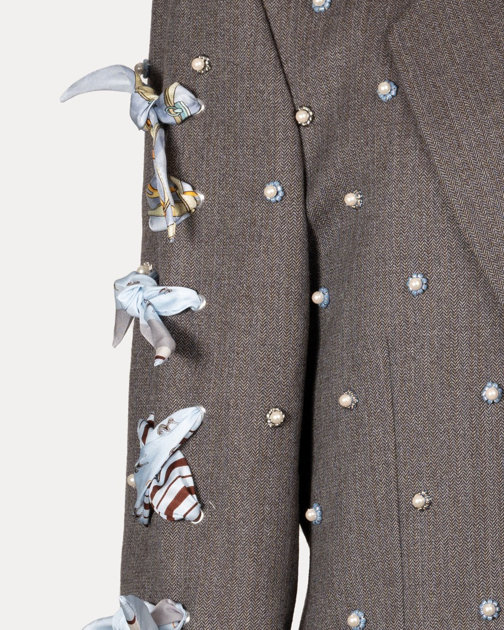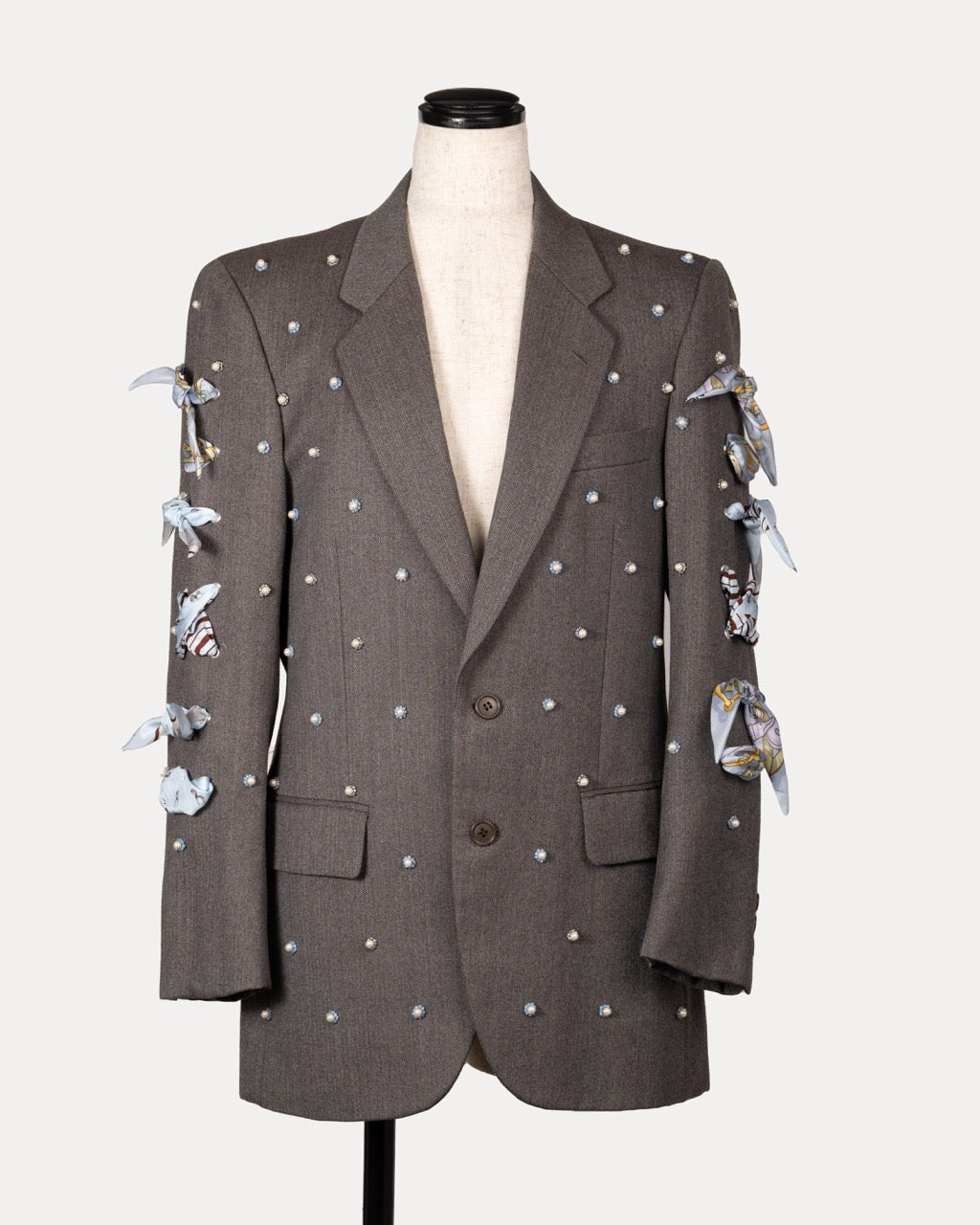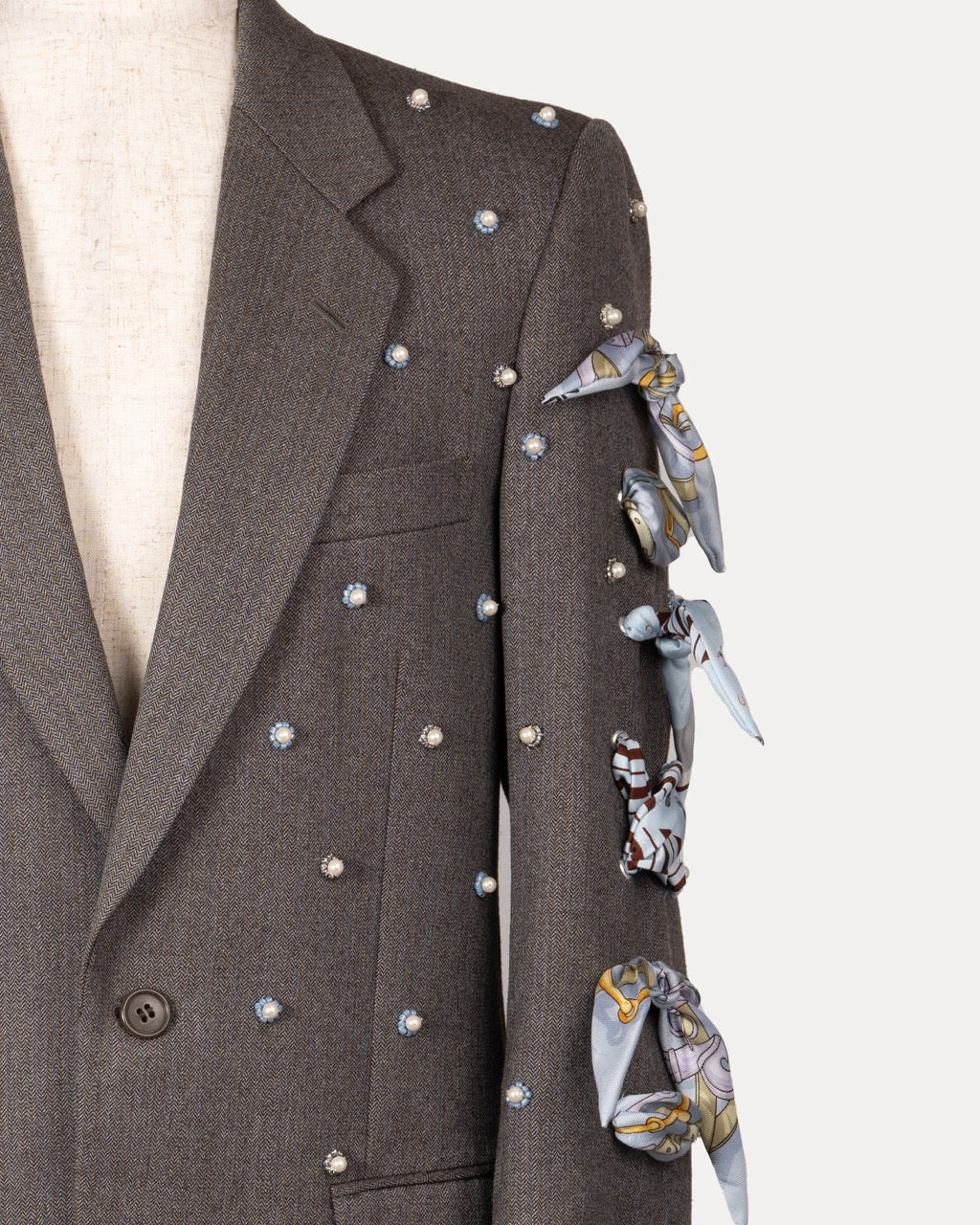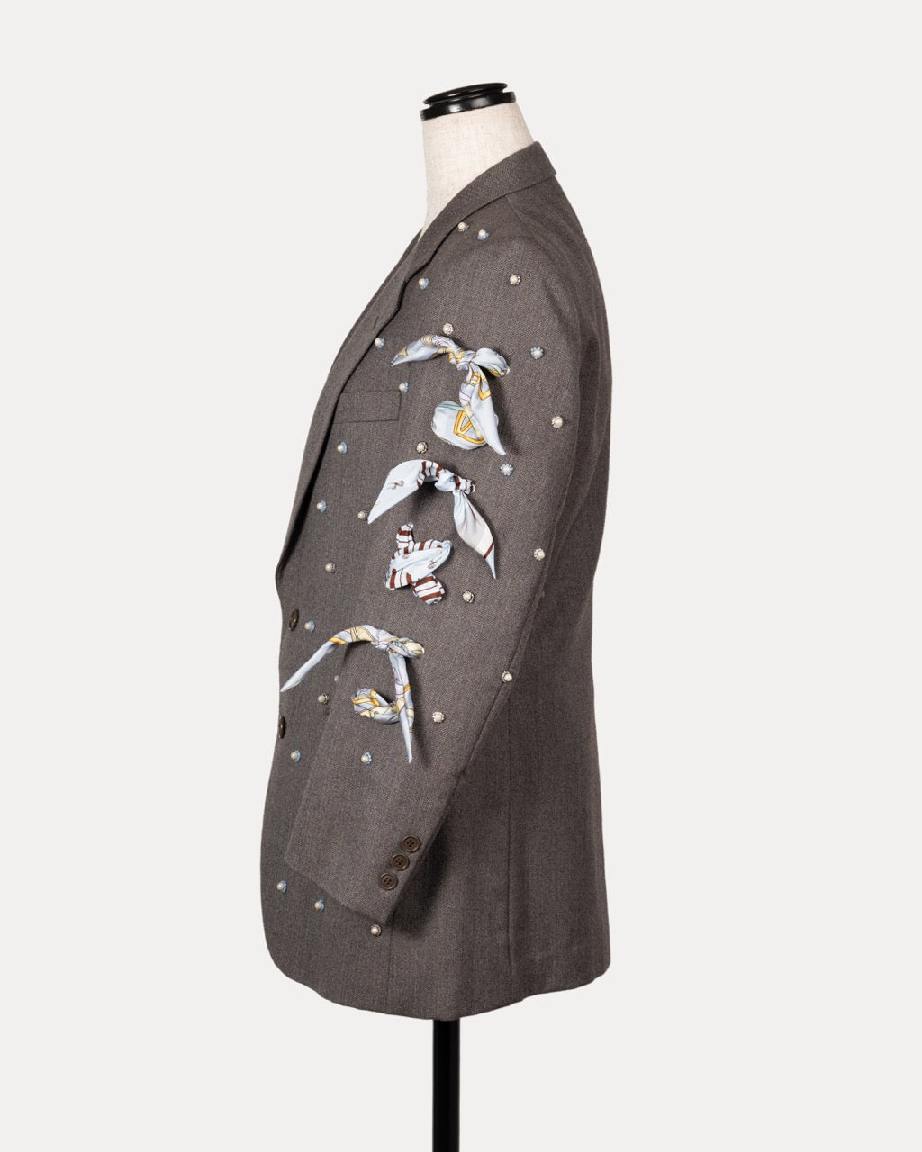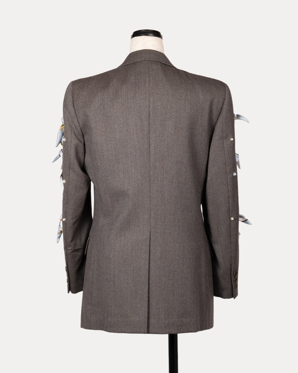 A vintage men’s jacket, transformed into women’s special wear. A one-of-a-kind piece updated with new details and accented with vintage luxury scarves. Rooted in its original history, the design moves between past and present, evolving into a quiet expression of modern femininity.